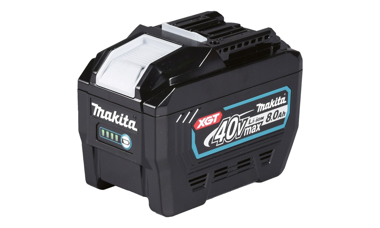 Li-Ionen-Akku der XGT-Serie mit 40 V max und einer Kapazität von 8,0 Ah. Mit dem Ladegerät DC40RA in 60 Minuten zu 80 % und in 76 Minuten voll geladen. Vier grüne LED zeigen die Restkapazität des Akkus. Das Akku-Gehäuse ist für den harten Baustelleneinsatz konzipiert und entspricht dem IP64-Schutzstandard.
