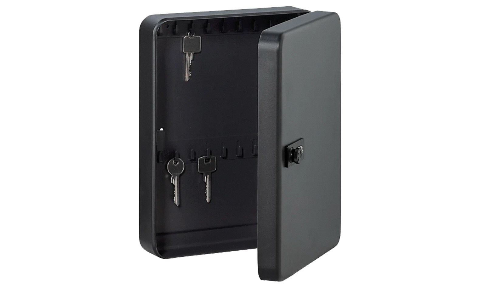 Burg Wächter Schlüsselbox mit 36 Haken, Farbe schwarz matt, 240mm Breite x 300mm Höhe x 80mm Tiefe. Verschließbar mit 3-stelligem Zahlenschloss, Armatur steht 15mm vor, Hakenabstand 23mm, inkl. Befestigungsmaterial.