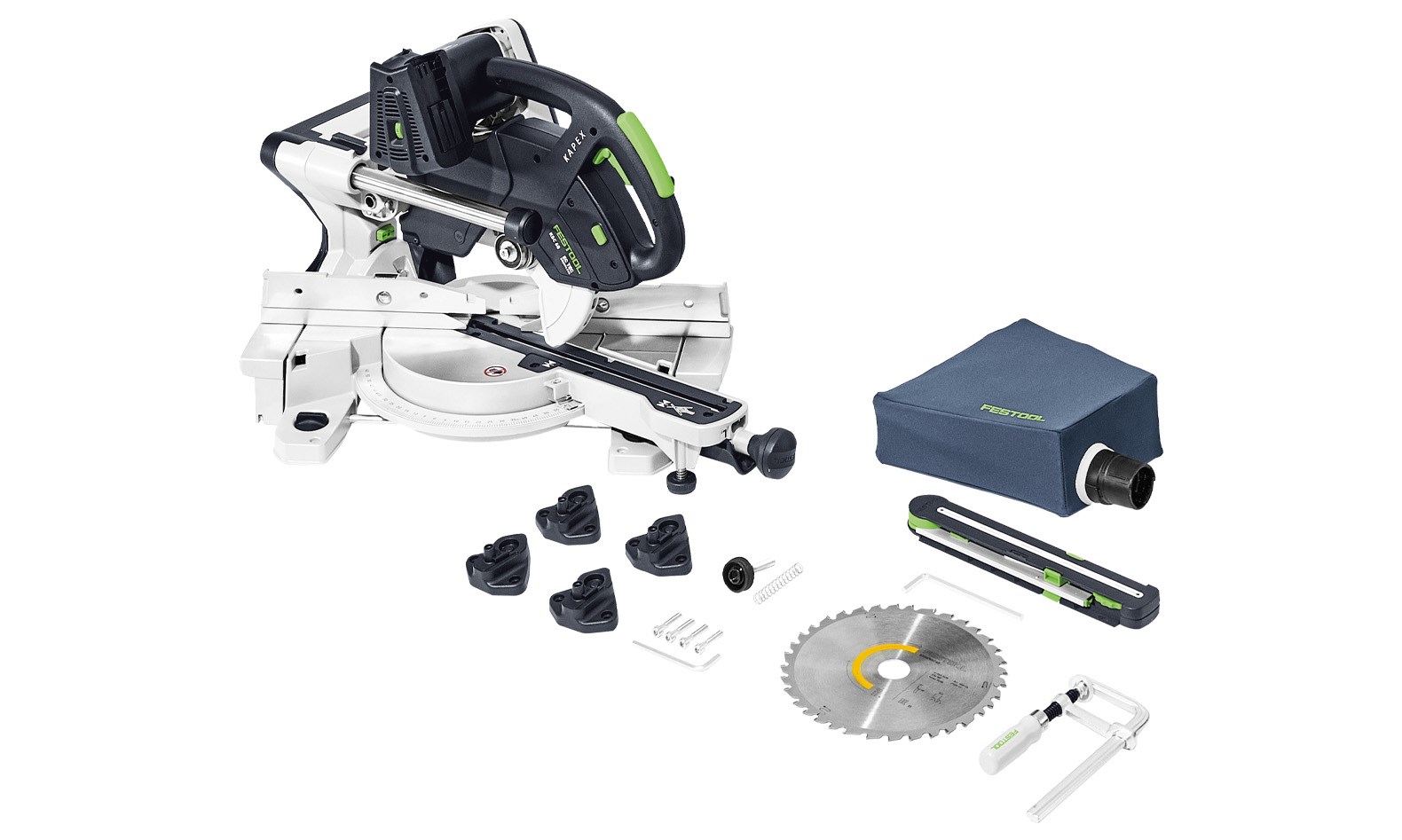 Kreissägeblatt WOOD UNIVERSAL HW 216x2,3x30 W36, Schraubzwinge FSZ 120, LED-Schlaglicht, Winkelschmiege, Erhöhung, Staubfangbeutel, Innensechskantschlüssel SW 6.