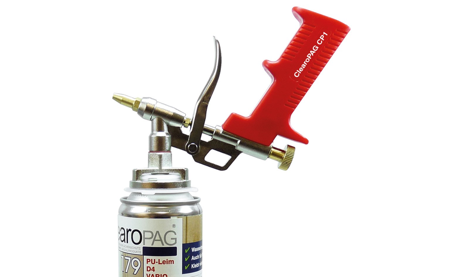 Dosiergerät für Flüssigklebstoffe, für die professionelle Applikation von PUR-Schaum, pastösen Massen, Leim, Länge Düsenrohr 185mm, rotes Gehäuse, materialführende Innenteile vollständig aus Metall, keine Aushärtungen im Gerät, Metallausführung mit Kunsstoffgriff.