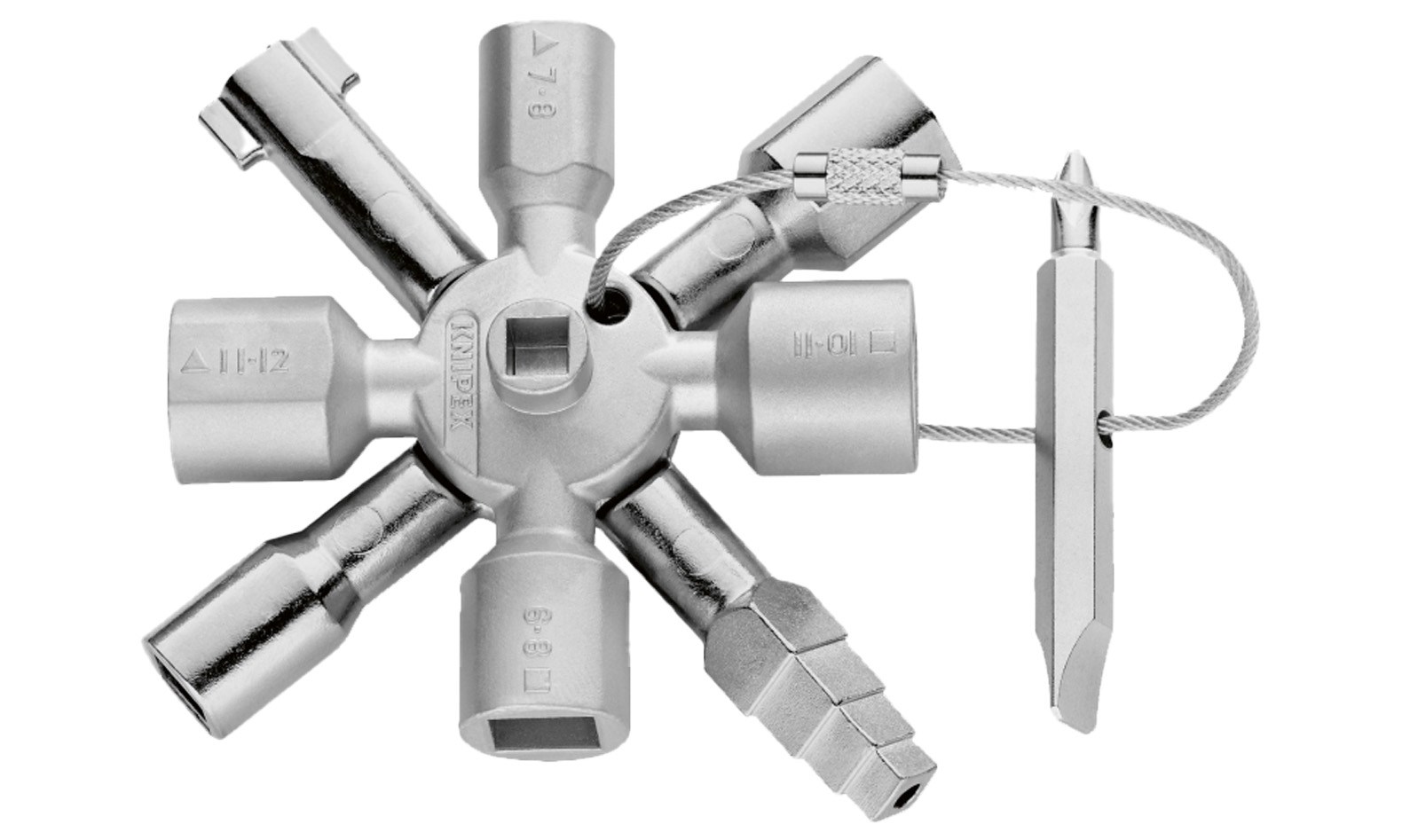 Multifunktionaler Schlüssel für Betätigung von Schließungen aus den Bereichen Gebäudetechnik (Heizung und Sanitär, Klima- und Belüftungstechnik, Elektrotechnik), Gas- und Wasserversorgung und Absperrsysteme. Schlüssel und Wendebit durch stabiles Edelstahl-Drahtseil verbunden