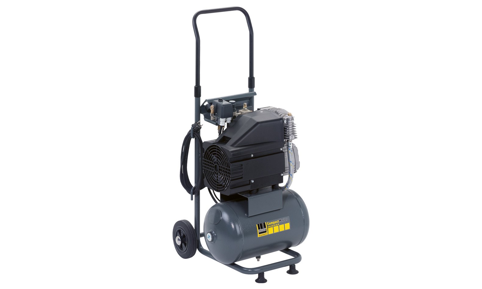Mobiler Kolbenkompressor. Anwendungen: Speziell für den mobilen Einsatz auf Baustellen und im Innenausbau. Luftabgänge mit Schnellkupplung für einfachen Anschluss von Druckluftgeräten. Alle zerbrechlichen Teile, wie Druckschalter, Manometer, Armaturen etc. sind gut geschützt. Direktgeflanschtes Aggregat. Ölgeschmiert. Kunststoffräder und Gummischwinger.