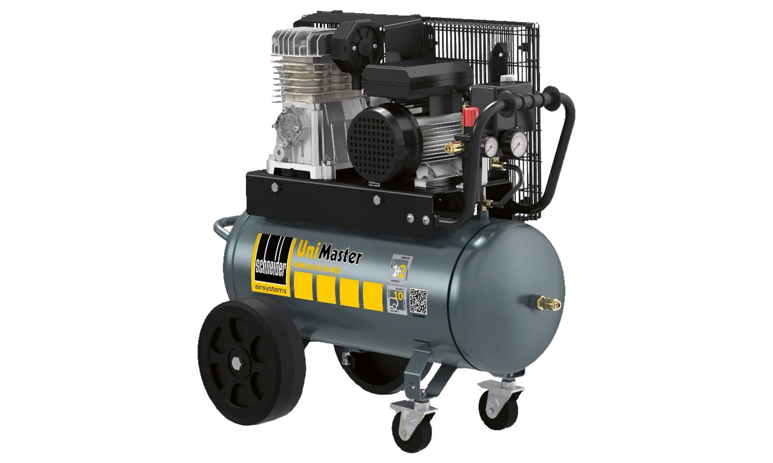 Komfortables Arbeiten durch Luftabgang direkt am Behälter und über Schnellkupplung am Filterdruckminderer, Keilriemengetriebener 2-Zylinder-Kolbenkompressor, 10 Jahre Garantie auf Behälter gegen Durchrostung