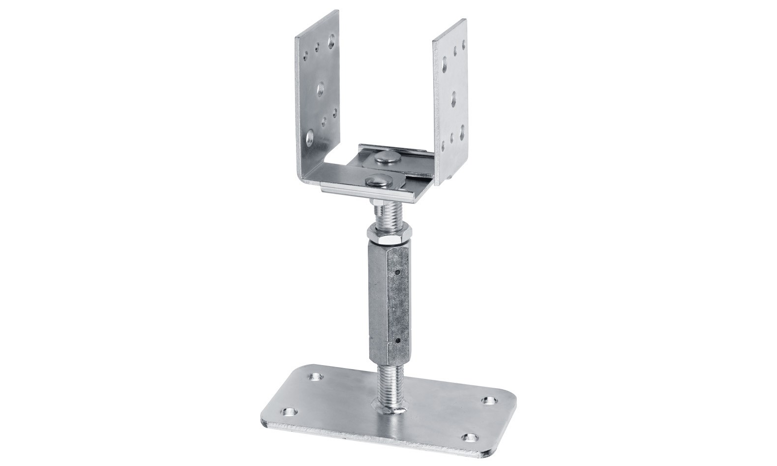 Dieser Pfostenträger auf Beton ist im eingebauten Zustand in der Höhe 150-200 mm verstellbar und hat eine von 70-150mm seitenverstellbare U-förmige Trägerplatte und ist damit für variable Holzbreiten einsetzbar.