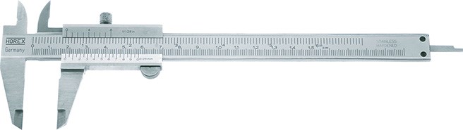 Taschenmessschieber, ISO 13385-1, Stahl, rostfrei, Nonius und Skala matt verchromt, 4-fach-Messung (Innen-, Außen-, Tiefen- und Stufenmessung), Gewindetabelle auf der Rückseite,