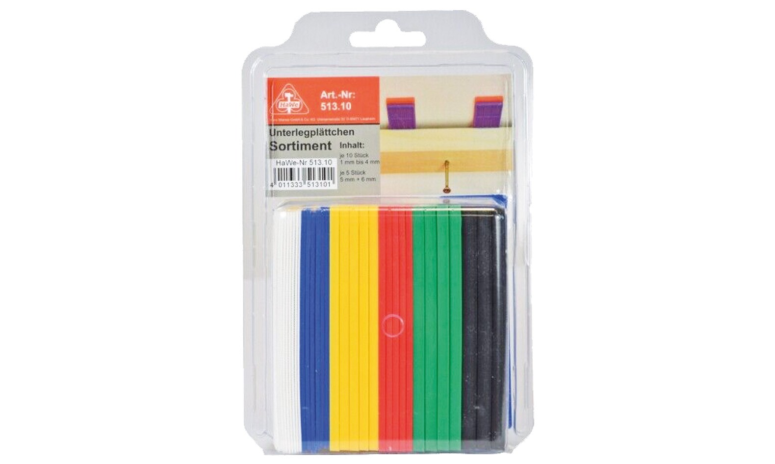 Justierklötze Sortiment gemischt, Stärke 1-4 mm je 10 Stück, 5-6 mm je 5 Stück, Länge 100 mm, Breite 30 mm. Packung = 50 Stück.
