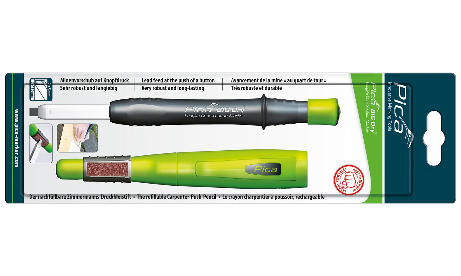 Pica 6060, der nachfüllbare Zimmermanns-Druckbleistift, sehr robust und langlebig, automatischer Minenvorschub auf Kopfdruck, nachfüllbar mit verschiedenen Ersatzminen, präzise Kantenführung beim Anzeichnen, ausgestattet mit einer FOR ALL Graphitmine 2B.