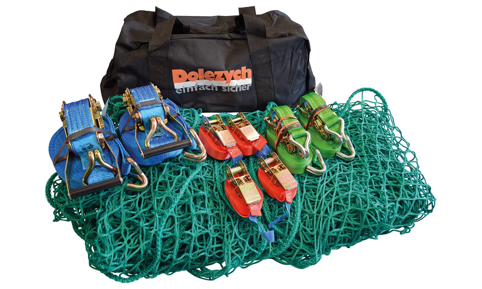 Zurrgurt-Set 10-teilig, nach DIN EN 12195-2, bestehend aus: 2 Zurrgurten, 50 mm, 8 m; 2 Zurrgurten, 35 mm, 6 m; 4 Zurrgurten, 25 mm, 4 m; 1 Container-Abdecknetz 3,5 x 5 m in Sporttasche.