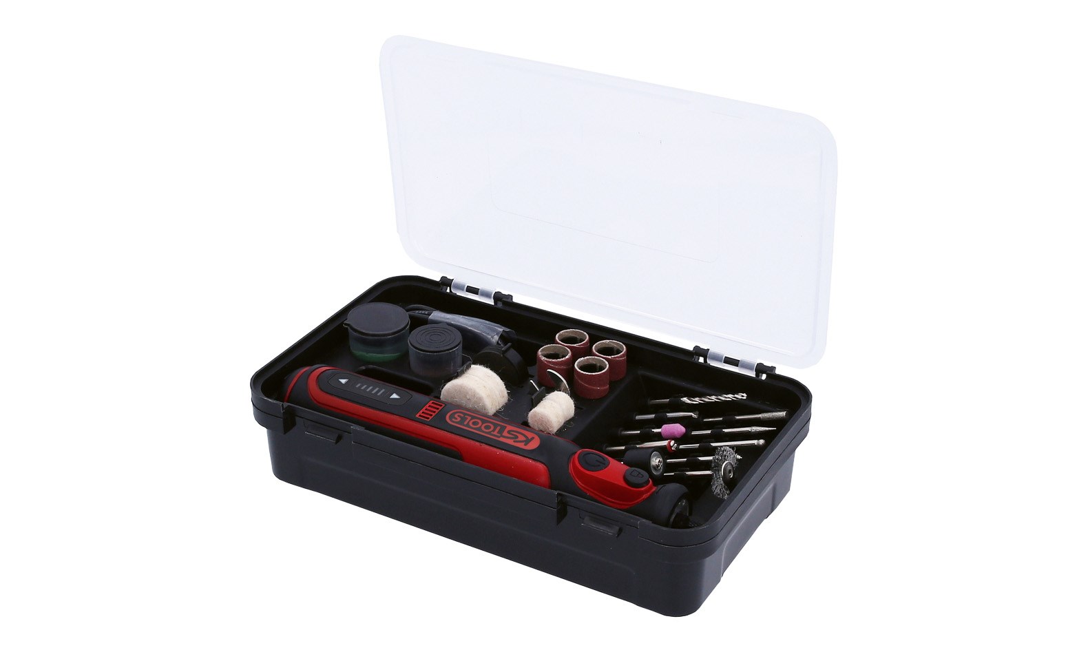 Für max. 3,2 mm Standard-Rotationswerkzeuge aller Marken, ideal für netzunabhängiges Arbeiten, geringes Gewicht, mit Rechtslauf, Spindelarretierung am Griff zum Wechsel der Einsätze, Lithium-Ionen-Hochleistungs-Akku, USB - C Ladeanschluss an der Unterseite, mit Ladeanzeige, LED-Arbeitslicht und 5-Gang-Drehzahleinstellung, umfangreiches 50-teiliges Zubehör-Set enthalten, in praktischer Kunststoffbox.