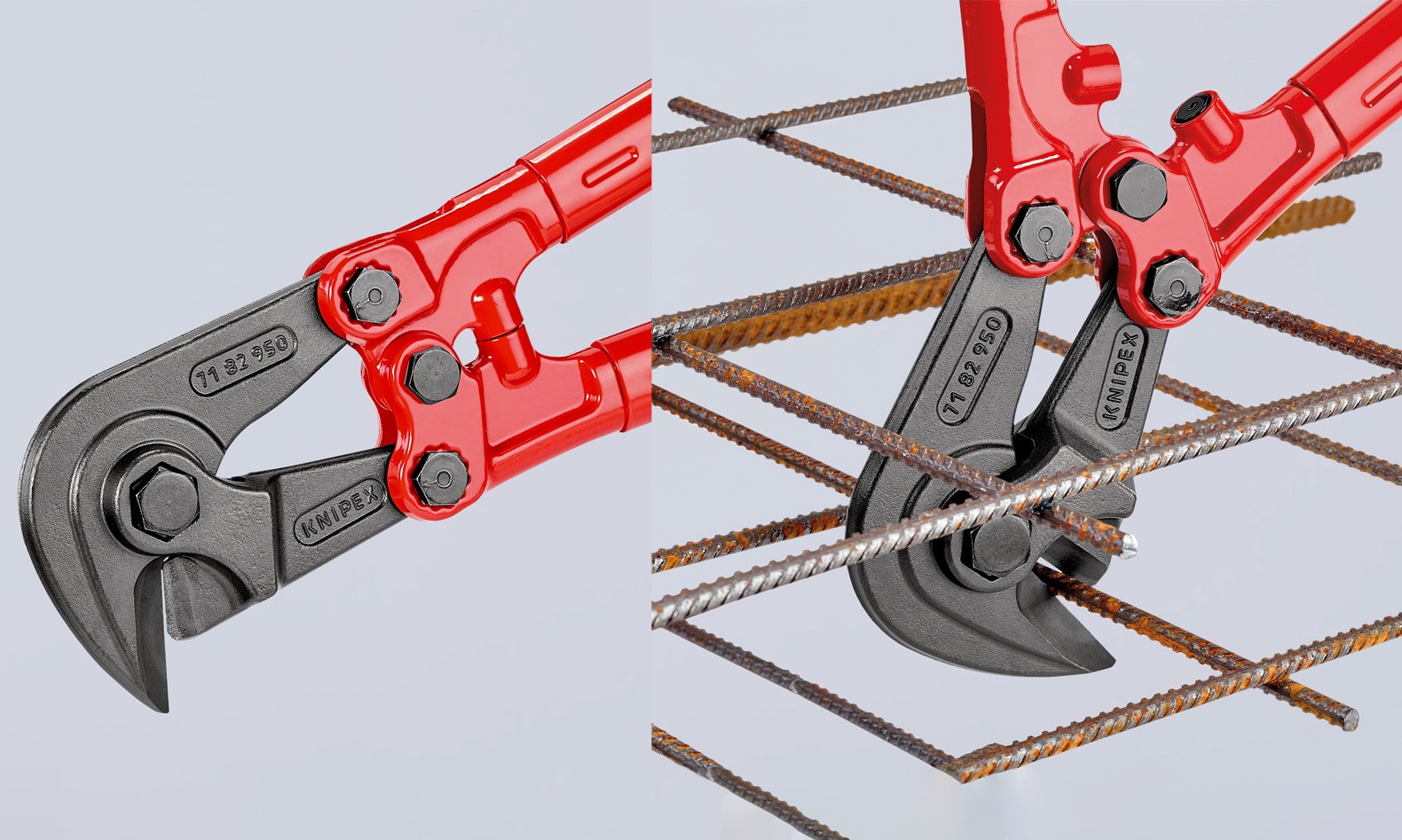 Mattenschneider für Baustahl, rot lackiert, Schneidleistung bis 40 HRc. Messer- und Rohrkopf aus Spezialstahl, gesenkgeschmiedet. Geringer Trennkraftaufwand, sicheres Greifen flach liegender Baustähle, nachstellbare und auswechselbare Messer.