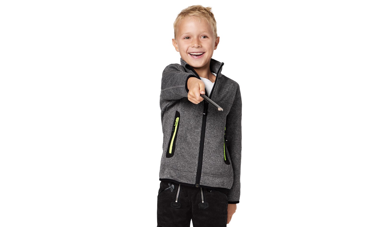 100% Polyester ,280 g/qm, extrem leichte und anschmiegsame Strick-Fleece-Jacke für Kinder, körpernahe modische Passform, 2 geräumige vordere Reißverschlussseitentaschen, 2 offene Innentaschen, YKK-Frontreißverschluss, Farbe anthrazit.