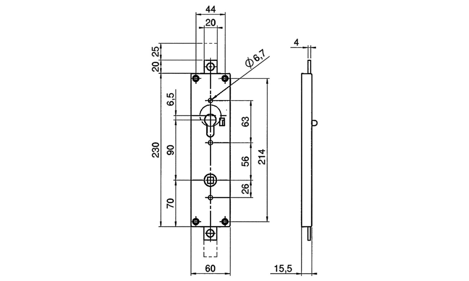 für Kipp- und Flügeltore 551, jedes Teil rundum vz., Stangenausschluss nach oben und unten, gerichtet für Profilzylinder, innen mit Auslöseknopf, automatisch schließend, Nuss 9mm, Entfernung 90mm.