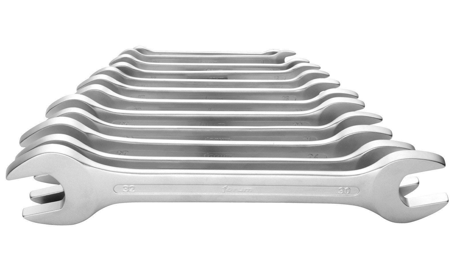 FORUM Gabelschlüsselsatz, aus Chrom Vanadium Stahl, geschmiedet, mattverchromt, Maulstellung 15°. Inhalt: 6x7, 8x9, 10x11, 12x13, 14x15, 16x17, 18x19, 20x22, 21x23, 24x27, 25x28, 30x32 mm.