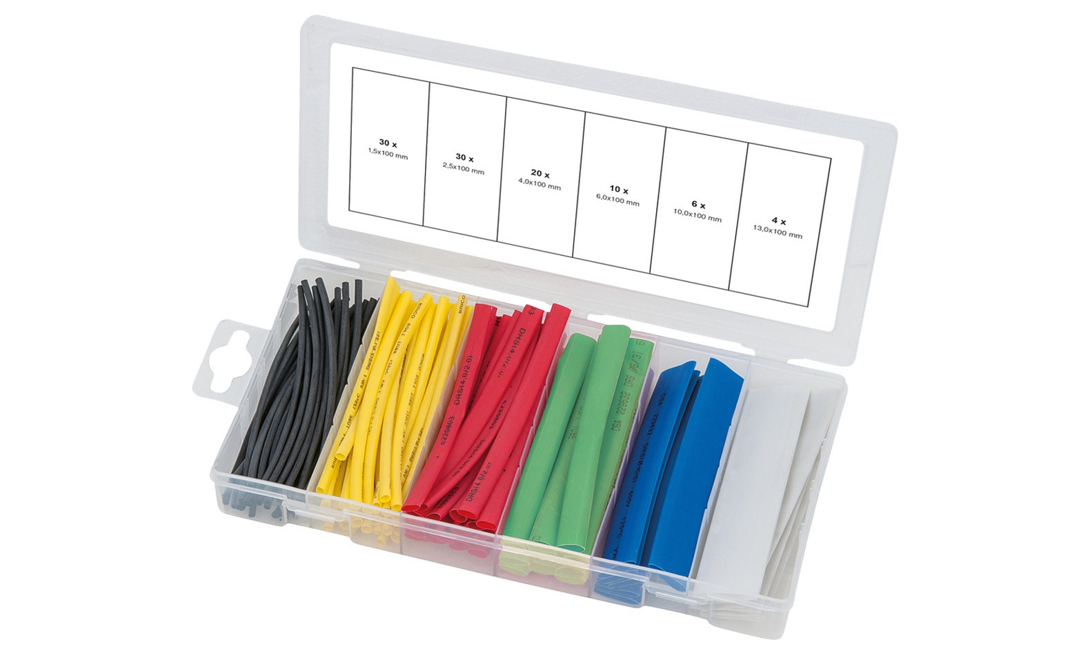 Schrumpfrate 2:1, Lieferung im Kunststoffkoffer, größen farbig gekennzeichnet.