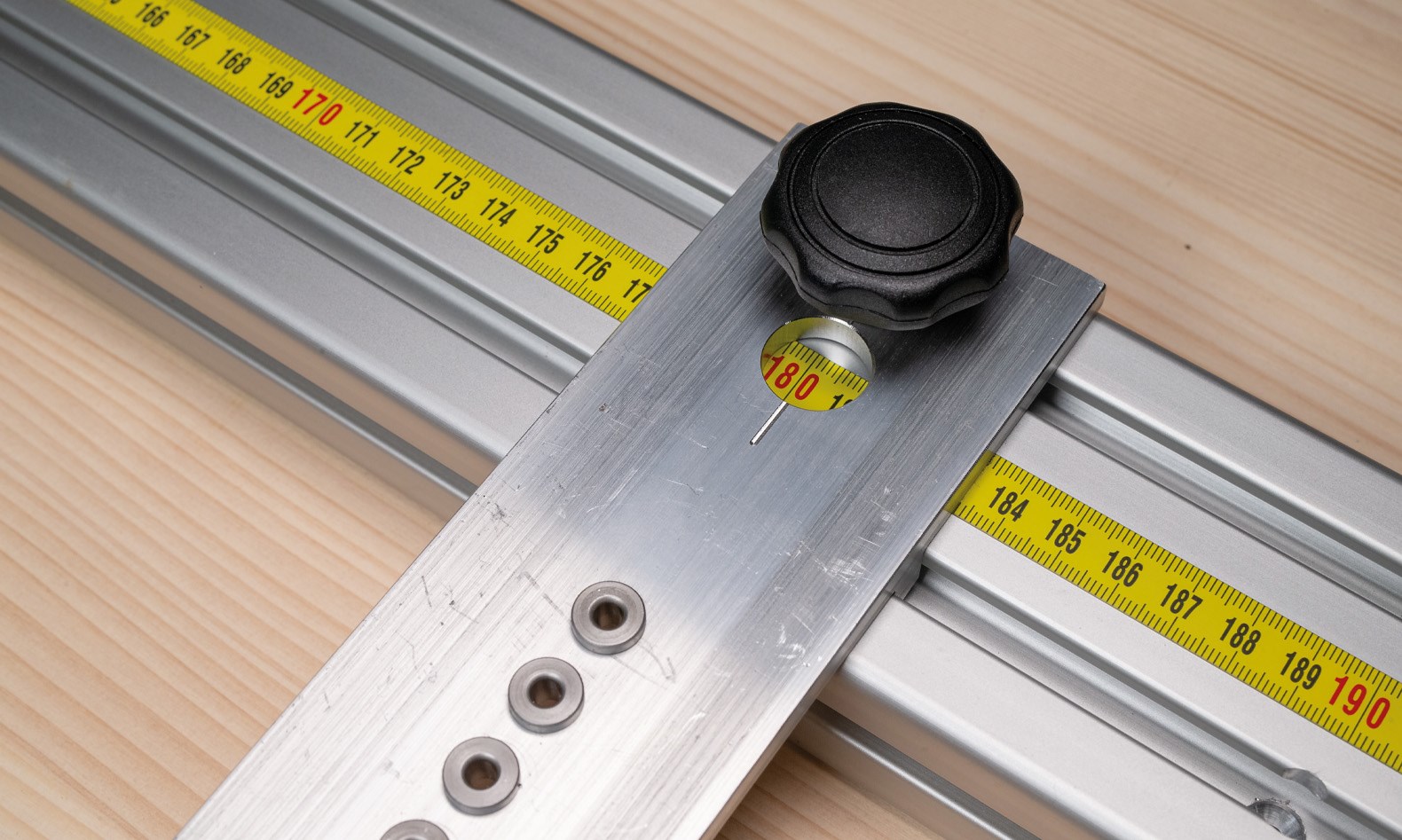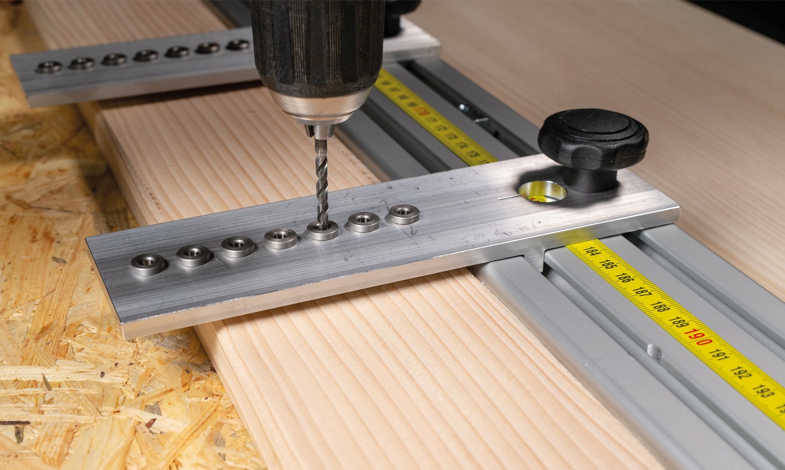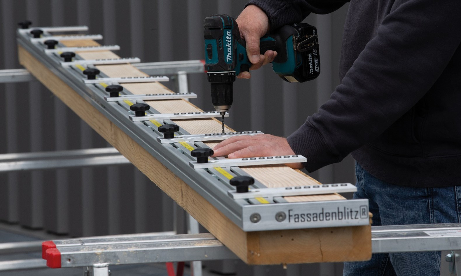 Eine Schablone zur Herstellung von horizontalen und vertikalen hinterlüfteten Holzfassaden, für maßhaltiges vorbohren von Einzelelementen. Für Fassadenprofile mit einer Materialstärke von 10 bis 40 mm. Bei Bedarf kann das Profil auch erhöht aufgelegt werden, sollte eine Materialstärke >40 mm bearbeitet werden müssen. Bei einer Vorfertigung der Fassadenprofile in Verbindung mit einem Waagrechten oder Lotrechtem Anschlag, am zu bekleidenden Gebäude ist das Schraubenbild nahezu perfekt und eine Zeiteinsparung von ca. 20 Prozent möglich. Bestehend aus 3 Stück Aluprofilen 40/80 Länge a 2,00 m, mit integriertem Maßband, 10 Stück Bohrschlitten und einem Längenanschlag. Bohrbuchsen Ø4mm.