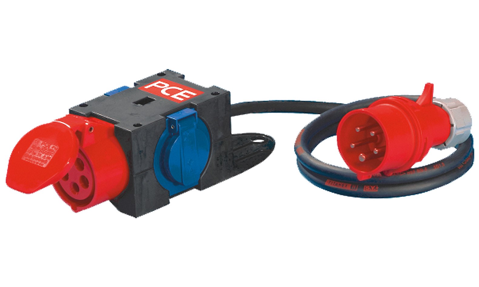 Mit 2,5m Anschlussleitung H07RN-F5G2,5 CEE, 5x16A/400V Ausgang 2x Schuko 250V. Leistung 9,5KW.